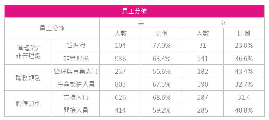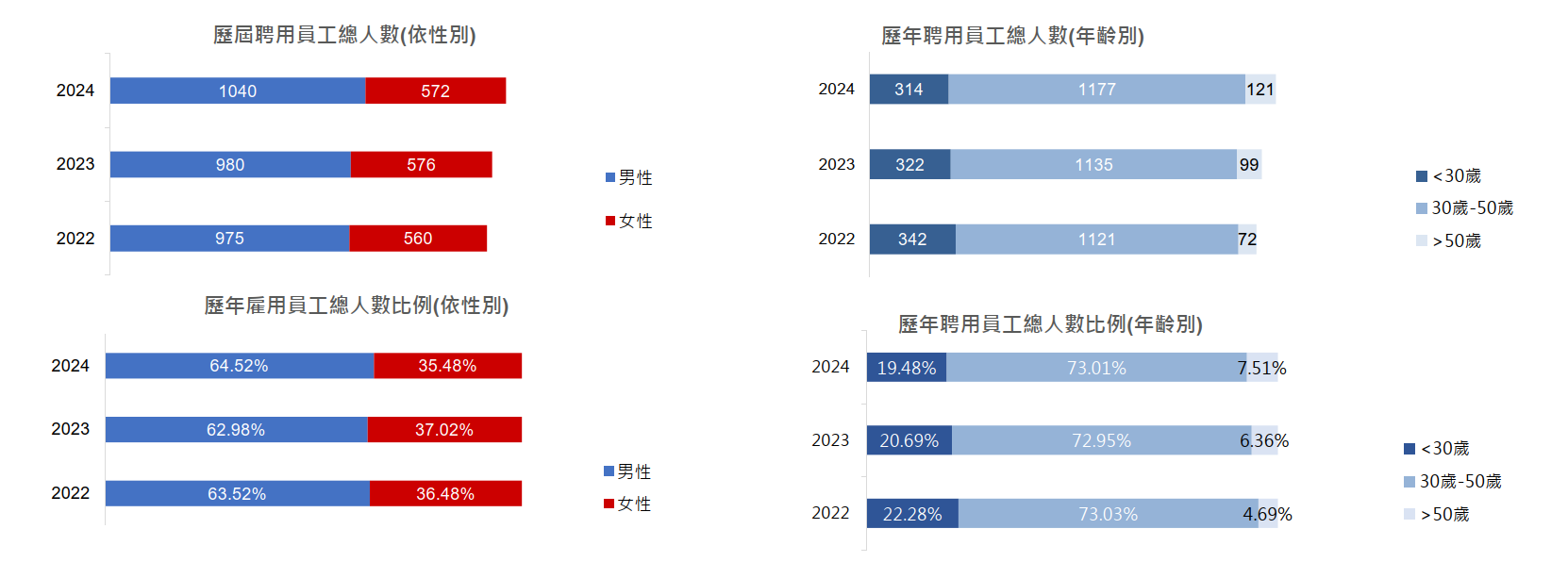 勤誠秉持著「以人為本」的精神,遵循「聯合國世界人權宣言」、「聯合國全球盟約」第一與第二條原則、「聯合國企業與人權指導原則」、國際勞工組織「工作基本原則與權利宣言」與當地法令規範,並透過加入「責任商業聯盟」,落實人權保障。此外,為了確保對於法規遵循的落實,持續關注任何影響營運之國內外政策與法令承諾提供員工人權保障,深入到每一個營運所在地。勤誠打造完善的就業及僱用條件、薪酬福利機制、人才培育計畫等內部機制,提供一個多元平等共融的友善職場環境。截至2024年底,全集團總人數為1,612人,包含:新莊總部、中國辦公室、美國辦公室、德國辦公室,及生產製造基地嘉義廠(嘉義)、前盛廠(東莞)與勤昆廠(崑山)、勤鋒廠(五股);女性員工572人占比為35.48%、男性員工1,040人占比為64.52%。